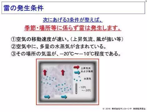 雷只要有以下3个条件: ①空气移动速度快; ②空气中含有大量水蒸气; ③发生位置的气温在-20℃~-0℃左右, 则任何季节和场所,都会发生。