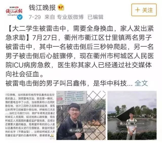 前几日,一大二学生遭遇雷击伤害,心脏骤停,经过两小时抢救奇迹般地恢复了心跳。