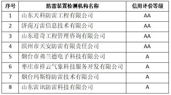 八个防雷装置检测机构信用评价结果公示
