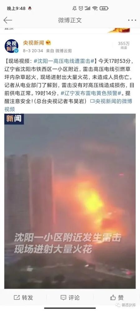 近期南北方全面进入主汛期,雷雨天气多发,大家出行一定要注意安全。昨日17时53分,辽宁省沈阳市铁西区一小区附近,雷击高压电线引燃草坪内杂草起火,现场迸射出大量火花。根据现场画面,一条巨大的火龙从高楼顶部斜坠击中地面,气势逼人,引得目击群众惊呼连连。