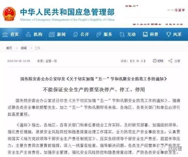 近日,国务院安委会办公室印发了《关于切实加强“五一”节和汛期安全防范工作的通知》,强调近期各类安全事故频繁发生,要求深入开展汛期安全隐患排查治理,发现隐患立即整改,一时不能完成整改的要严格落实针对性的安全防范措施;若出现雷电等极端恶劣天气,不能保证安全生产的要坚决停产、停工、停用。