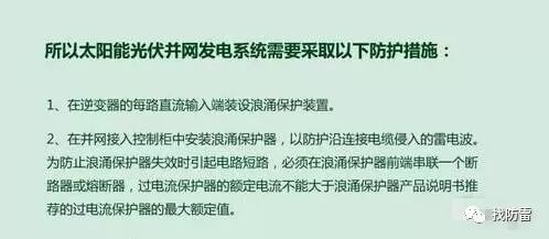 如果光伏设备处于保护范围内,可以不用另加外部防雷系统,反之则要另加外部防雷系统。良好的接地使接地电阻减小,才能把雷电流导入大地,减小地电位,各接地装置都要通过接地排相互连接以实现共地防止地电位反击。