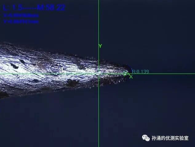 图 A组针头雷击点伤痕观察,针头已经熔融为0.139mm曲率半径